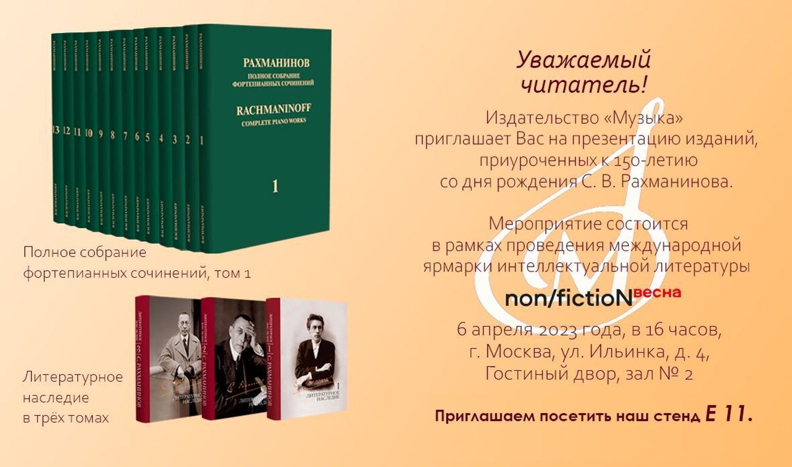 6 апреля 2023 года в 16 часов в рамках проведения ярмарки состоится презентация изданий, приуроченных к 150-летию С. В. Рахманинова.